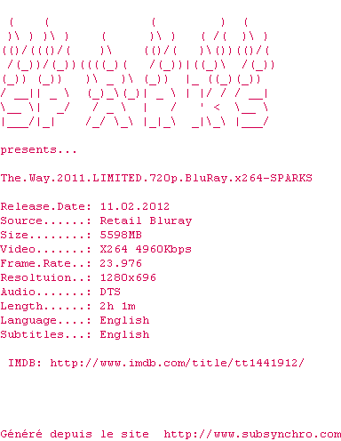 Les sous-titres que j'ajoute ici sont parfaitement synchro avec la release : The Way 2011 LIMITED 720p BRRip x264 AC3-26K.mp4