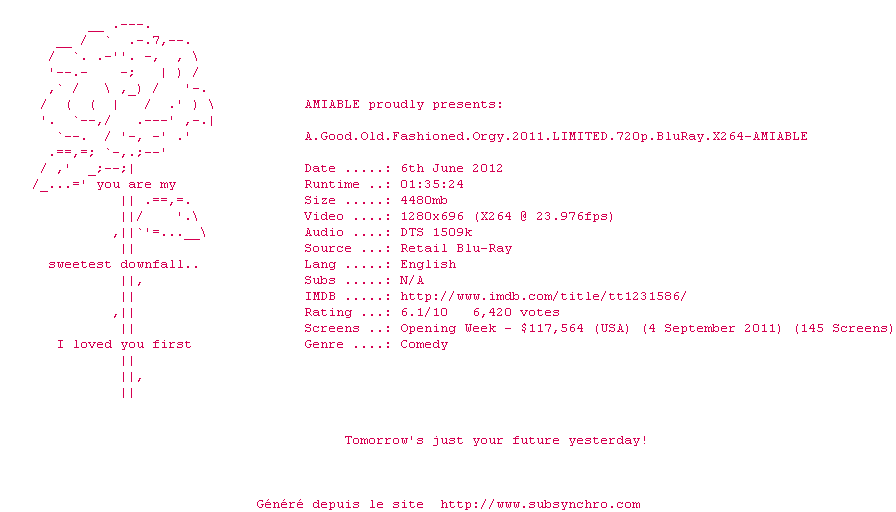 Y avez-vous pense ? Nous proposons déjà 5 sous-titres pour le film A Good Old Fashioned Orgy. Avez-vous essaye de voir si ces sous-titres etaient compatibles avec cette release ? On vous laisse le soin de tester cela pour nous et de contribuer au site en postant le sous-titre en cas de compatiblite constatee !