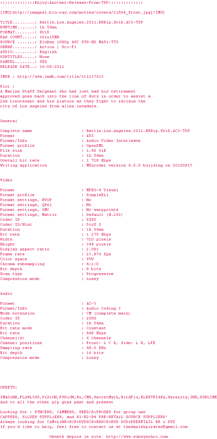 Battle.Los.Angeles.2011.BRRip.XviD.AC3-TDP.srt Ajouté par Pierrick Ajoute le 17-05-2011 01:47:35 Format : SRT Italique : Non Taille : 0.00Ko Telechargement : 380 Ajouter cette release à ma collection en cas de telechargement des sous-titres 0 0 0 Telecharger le ZiP contenant NFO, Affiche, Sous-titre (*.srt) Commentez le fichier Battle.Los.Angeles.2011.BRRip.XviD.AC3-TDP.srt Commentez le fichier Battle.Los.Angeles.2011.BRRip.XviD.AC3-TDP.srt Commentez ce fichier Le fichier 1120-1305589655.srt n'existe pas ! Telechargez le RSS « Fichier de la release Battle.Los.Angeles.2011.BRRip.XviD.AC3-TDP » Retour au film « World Invasion : Battle Los Angeles »