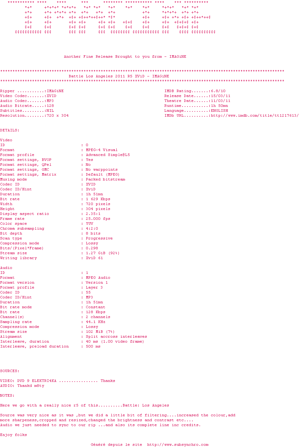 Battle-Los-Angeles-2011.r5.xvid.Imagine.srt Ajouté par Subtox Ajoute le 16-05-2011 09:02:44 Format : SRT Italique : Non Taille : 0.00Ko Telechargement : 397 Thx Subtox & Tiana Ajouter cette release à ma collection en cas de telechargement des sous-titres 0 0 0 Telecharger le ZiP contenant NFO, Affiche, Sous-titre (*.srt) Commentez le fichier Battle-Los-Angeles-2011.r5.xvid.Imagine.srt Commentez le fichier Battle-Los-Angeles-2011.r5.xvid.Imagine.srt Commentez ce fichier Le fichier 2355-1305529364.srt n'existe pas ! Telechargez le RSS « Fichier de la release Battle.Los.Angeles.2011.R5.XViD-IMAGiNE » Retour au film « World Invasion : Battle Los Angeles »
