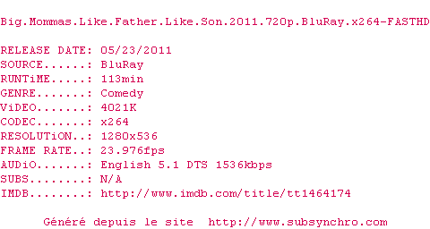 Y avez-vous pense ? Nous proposons déjà 4 sous-titres pour le film Big Mamma : De Père en Fils. Avez-vous essaye de voir si ces sous-titres etaient compatibles avec cette release ? On vous laisse le soin de tester cela pour nous et de contribuer au site en postant le sous-titre en cas de compatiblite constatee !