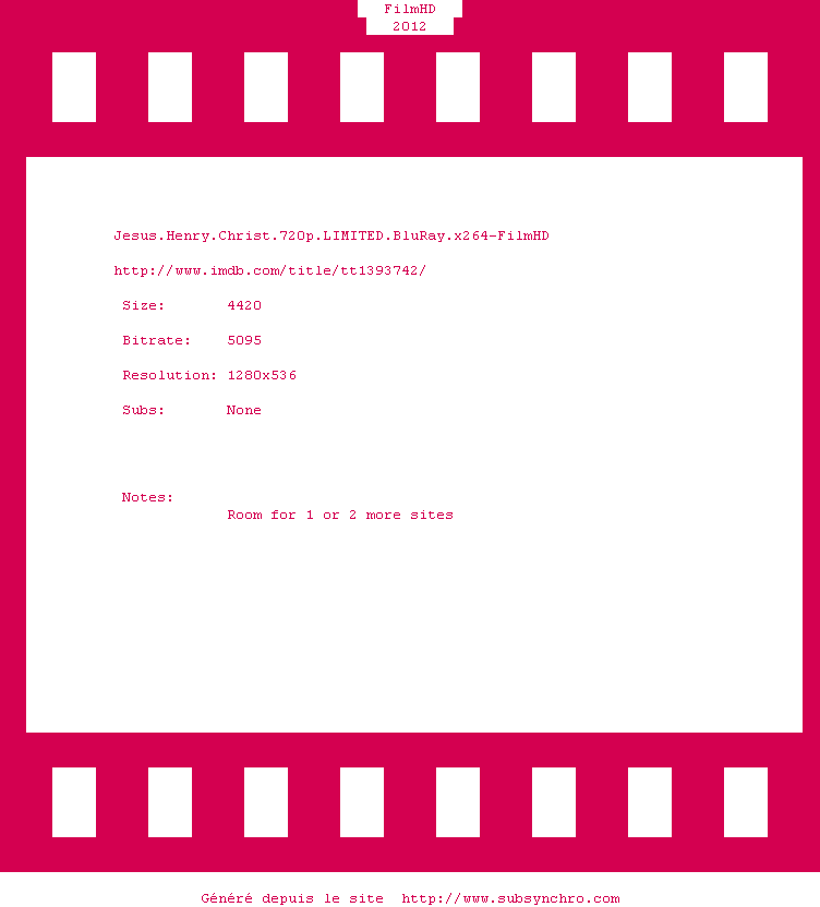 Y avez-vous pense ? Nous proposons déjà 2 sous-titres pour le film Jesus Henry Christ. Avez-vous essaye de voir si ces sous-titres etaient compatibles avec cette release ? On vous laisse le soin de tester cela pour nous et de contribuer au site en postant le sous-titre en cas de compatiblite constatee !