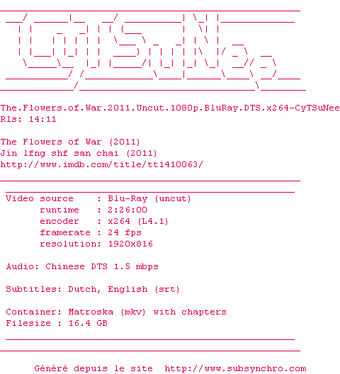 Y avez-vous pense ? Nous proposons déjà 5 sous-titres pour le film The Flowers of War. Avez-vous essaye de voir si ces sous-titres etaient compatibles avec cette release ? On vous laisse le soin de tester cela pour nous et de contribuer au site en postant le sous-titre en cas de compatiblite constatee !