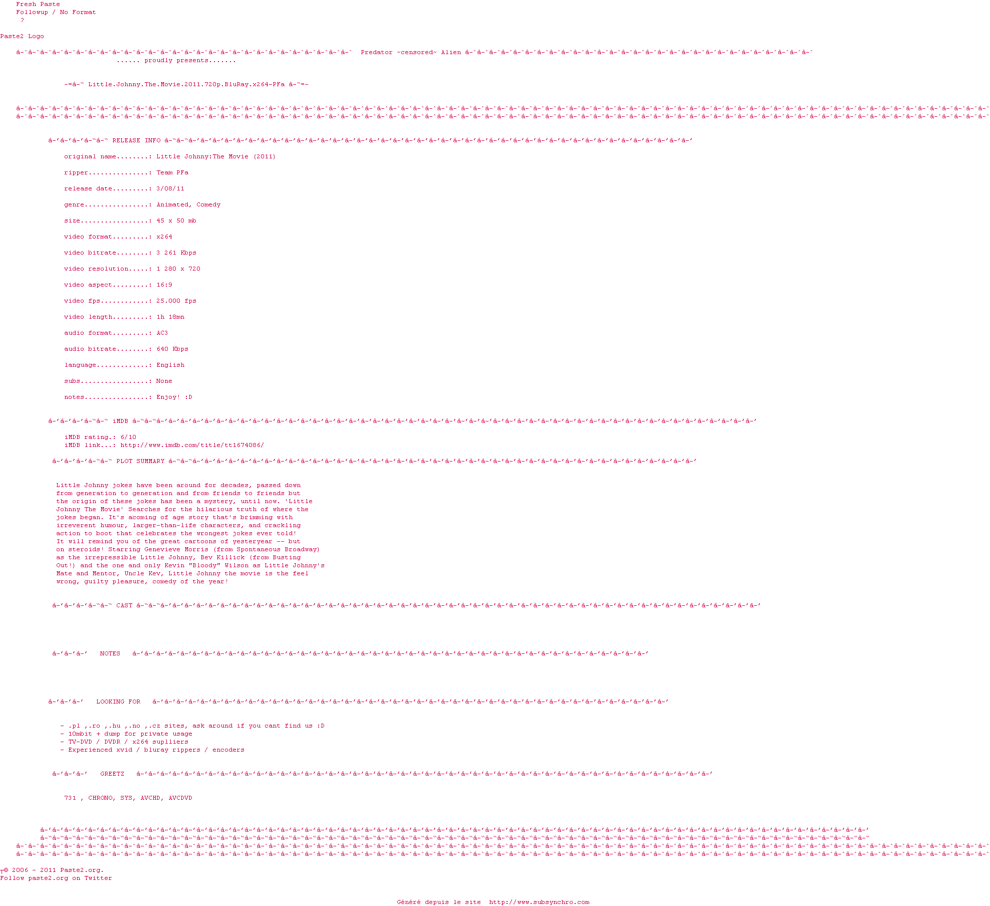 Telechargez le RSS « Fichier de la release Little.Johnny.The.Movie.2011.720p.BluRay.x264-PFa »