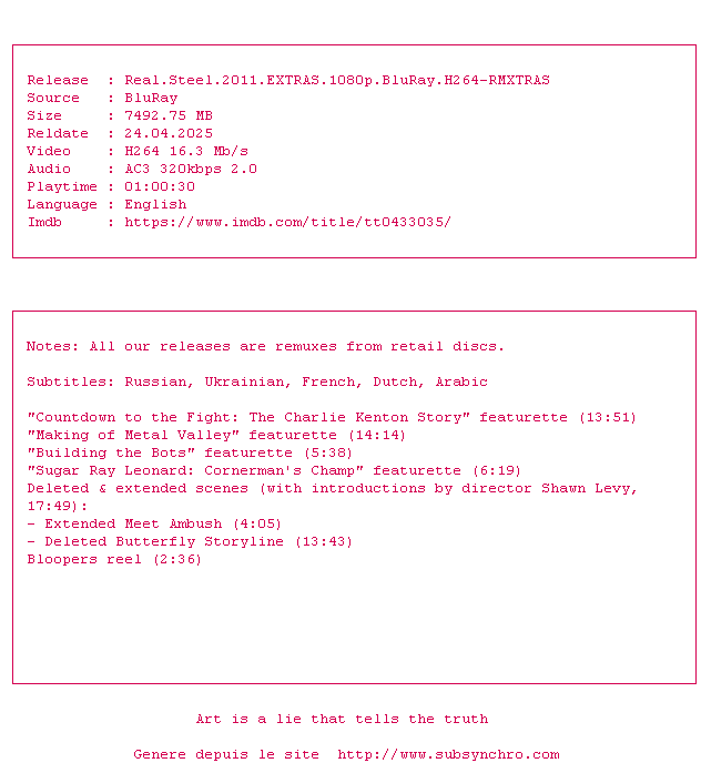 Y avez-vous pense ? Nous proposons déjà 10 sous-titres pour le film Real Steel. Avez-vous essaye de voir si ces sous-titres etaient compatibles avec cette release ? On vous laisse le soin de tester cela pour nous et de contribuer au site en postant le sous-titre en cas de compatiblite constatee !