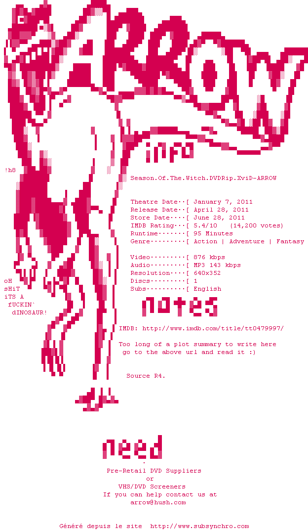 Season.Of.The.Witch.2011.ARROW.FRENCH.srt Ajouté par SubSynchro Ajoute le 07-05-2011 10:19:29 Format : SRT Italique : Non Taille : 0.00Ko Telechargement : 445 Merci àigo Ajouter cette release à ma collection en cas de telechargement des sous-titres 0 0 0 Telecharger le ZiP contenant NFO, Affiche, Sous-titre (*.srt) Commentez le fichier Season.Of.The.Witch.2011.ARROW.FRENCH.srt Commentez le fichier Season.Of.The.Witch.2011.ARROW.FRENCH.srt Commentez ce fichier Le fichier 1-1304756390.srt n'existe pas ! Telechargez le RSS « Fichier de la release Season.Of.The.Witch.DVDRip.XviD-ARROW » Retour au film « Le Dernier des Templiers »