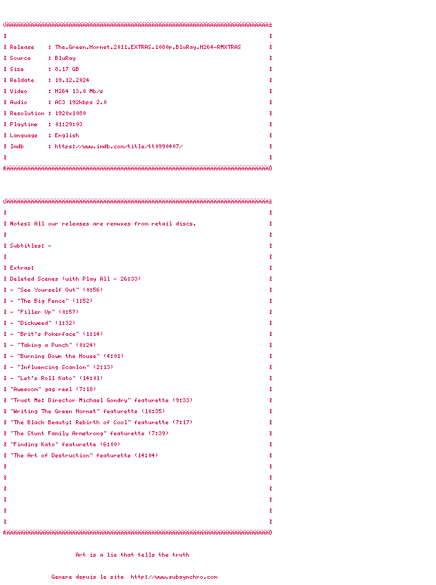 Y avez-vous pense ? Nous proposons déjà 13 sous-titres pour le film The Green Hornet. Avez-vous essaye de voir si ces sous-titres etaient compatibles avec cette release ? On vous laisse le soin de tester cela pour nous et de contribuer au site en postant le sous-titre en cas de compatiblite constatee !