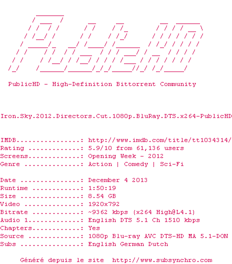Y avez-vous pense ? Nous proposons déjà 12 sous-titres pour le film Iron Sky. Avez-vous essaye de voir si ces sous-titres etaient compatibles avec cette release ? On vous laisse le soin de tester cela pour nous et de contribuer au site en postant le sous-titre en cas de compatiblite constatee !