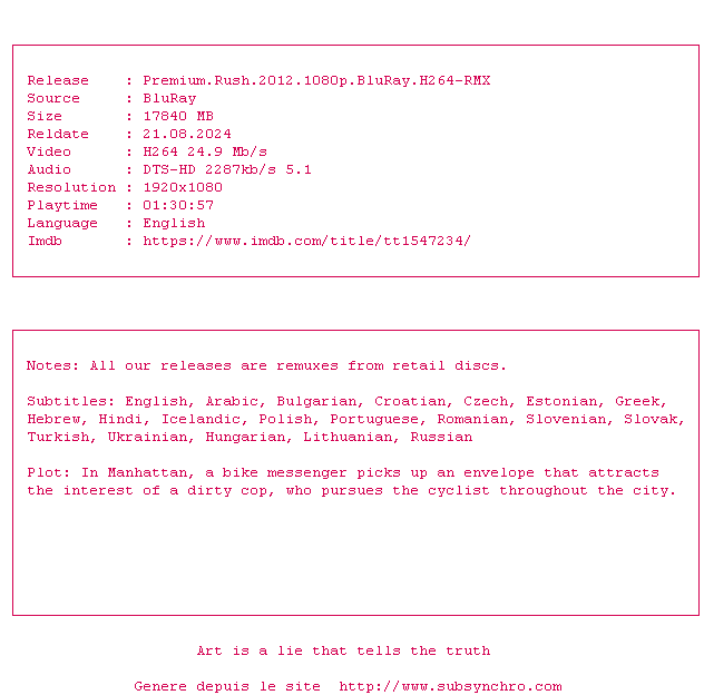Y avez-vous pense ? Nous proposons déjà 12 sous-titres pour le film Premium Rush. Avez-vous essaye de voir si ces sous-titres etaient compatibles avec cette release ? On vous laisse le soin de tester cela pour nous et de contribuer au site en postant le sous-titre en cas de compatiblite constatee !
