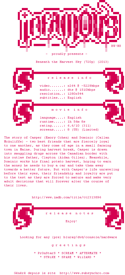 Telechargez le RSS « Fichier de la release Beneath.the.Harvest.Sky.2013.LiMiTED.720p.BluRay.x264-iNFAMOUS »
