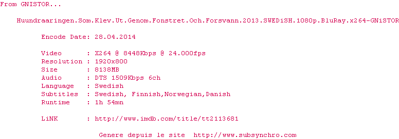 Y avez-vous pense ? Nous proposons déjà 4 sous-titres pour le film Vieux qui ne voulait pas fêter son anniversaire / The 100 Year-Old Man Who Climbed Out the Window and Disappeared. Avez-vous essaye de voir si ces sous-titres etaient compatibles avec cette release ? On vous laisse le soin de tester cela pour nous et de contribuer au site en postant le sous-titre en cas de compatiblite constatee !