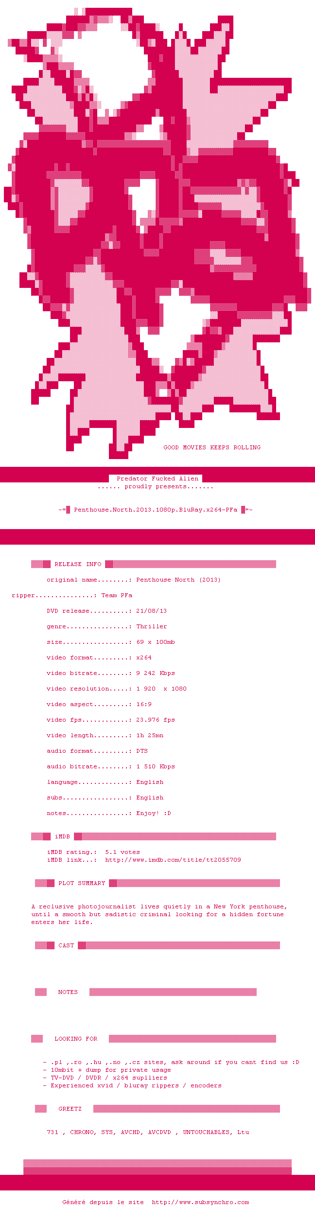 Y avez-vous pense ? Nous proposons déjà 1 sous-titre pour le film Penthouse North. Avez-vous essaye de voir si ces sous-titres etaient compatibles avec cette release ? On vous laisse le soin de tester cela pour nous et de contribuer au site en postant le sous-titre en cas de compatiblite constatee !