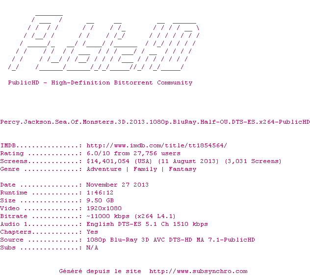 La release Percy.Jackson.Sea.Of.Monsters.3D.2013.1080p.BluRay.Half-OU.DTS-ES.x264-PublicHD est en 3D