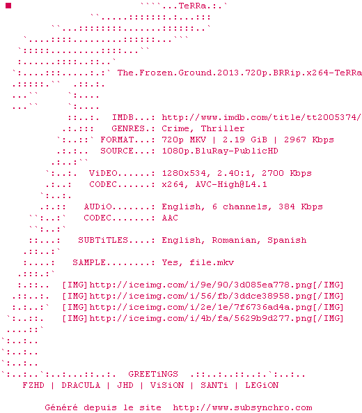 Suspect.The.Frozen.Ground.2013.TRUEFRENCH.720p.Bluray.x264.DTS-WBN.srt Ajouté par Alexnhc Ajoute le 18-01-2014 10:32:12 Format : SRT Italique : Oui Taille : 0.00Ko Telechargement : 61 Sous-titre Extrait d'un DVD Z2 Ajouter cette release à ma collection en cas de telechargement des sous-titres 0 0 0 Telecharger le ZiP contenant NFO, Affiche, Sous-titre (*.srt) Commentez le fichier Suspect.The.Frozen.Ground.2013.TRUEFRENCH.720p.Bluray.x264.DTS-WBN.srt Commentez le fichier Suspect.The.Frozen.Ground.2013.TRUEFRENCH.720p.Bluray.x264.DTS-WBN.srt Commentez ce fichier Le fichier 6678-1390037532.srt n'existe pas ! Telechargez le RSS « Fichier de la release The.Frozen.Ground.2013.720p.BRRip.x264-TeRRa » Retour au film « Suspect »