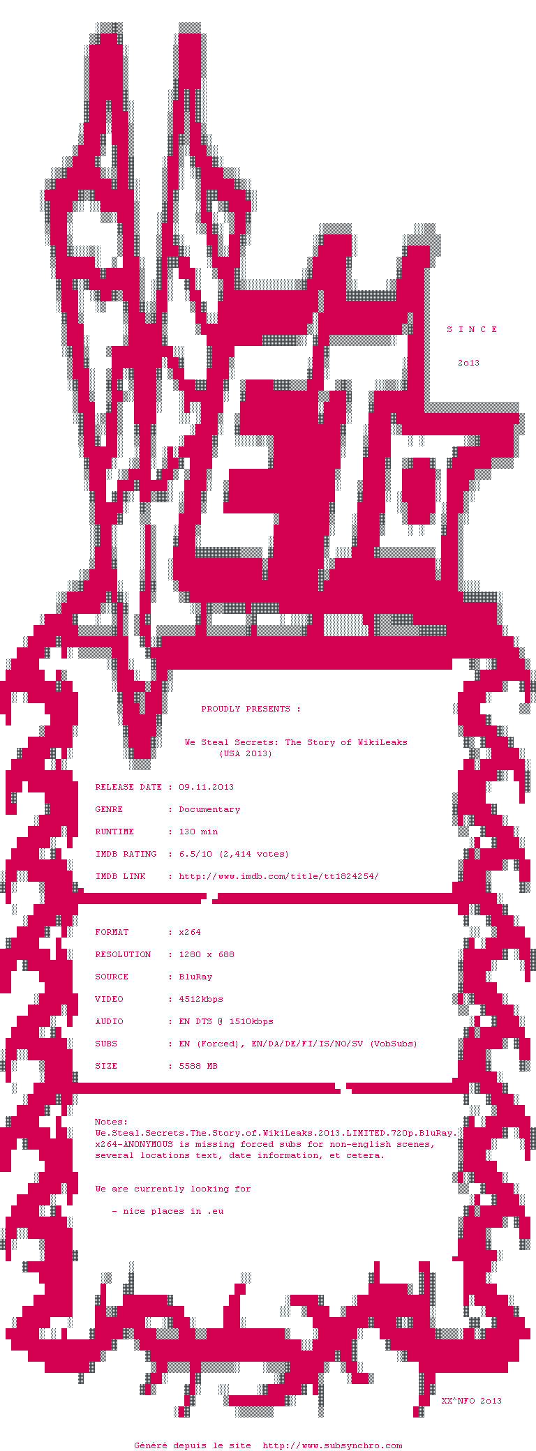 Y avez-vous pense ? Nous proposons déjà 3 sous-titres pour le film We Steal Secrets: The Story of WikiLeaks. Avez-vous essaye de voir si ces sous-titres etaient compatibles avec cette release ? On vous laisse le soin de tester cela pour nous et de contribuer au site en postant le sous-titre en cas de compatiblite constatee !