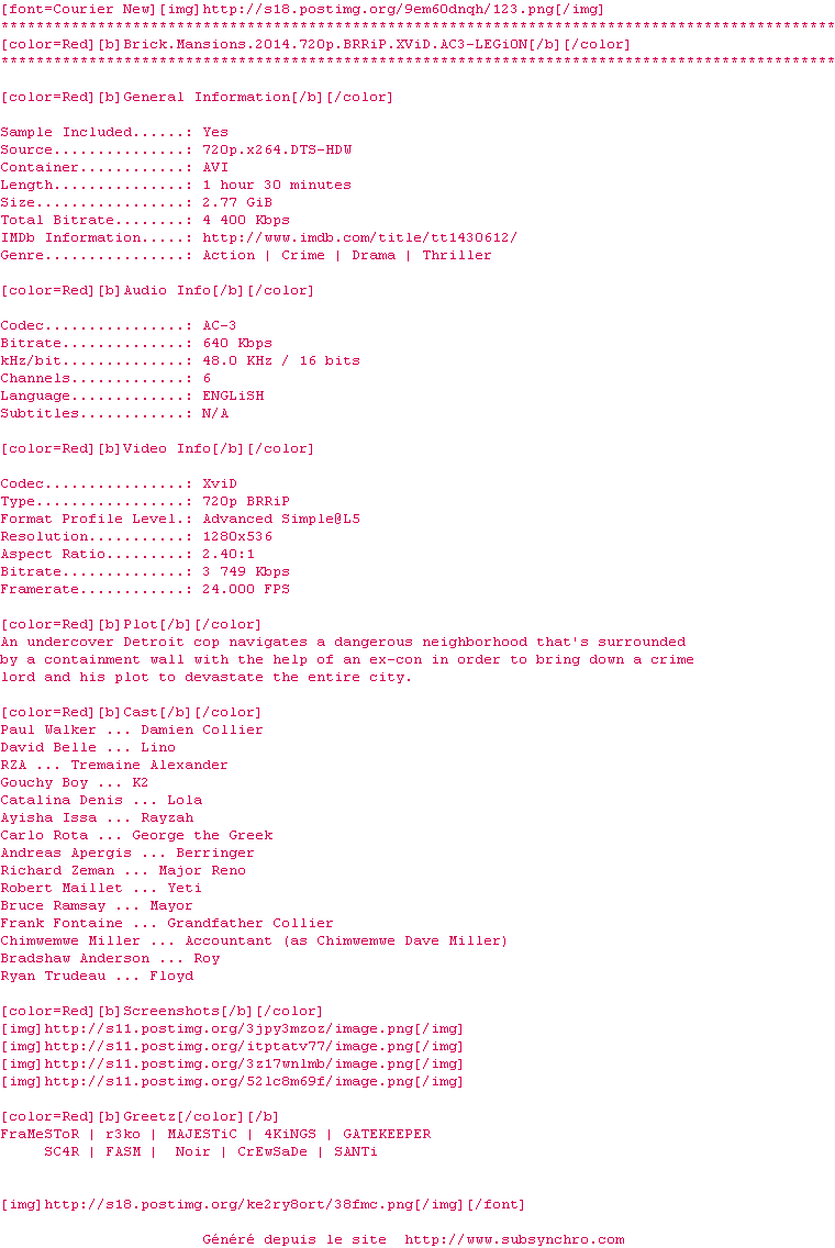 Y avez-vous pense ? Nous proposons déjà 8 sous-titres pour le film Brick Mansions. Avez-vous essaye de voir si ces sous-titres etaient compatibles avec cette release ? On vous laisse le soin de tester cela pour nous et de contribuer au site en postant le sous-titre en cas de compatiblite constatee !