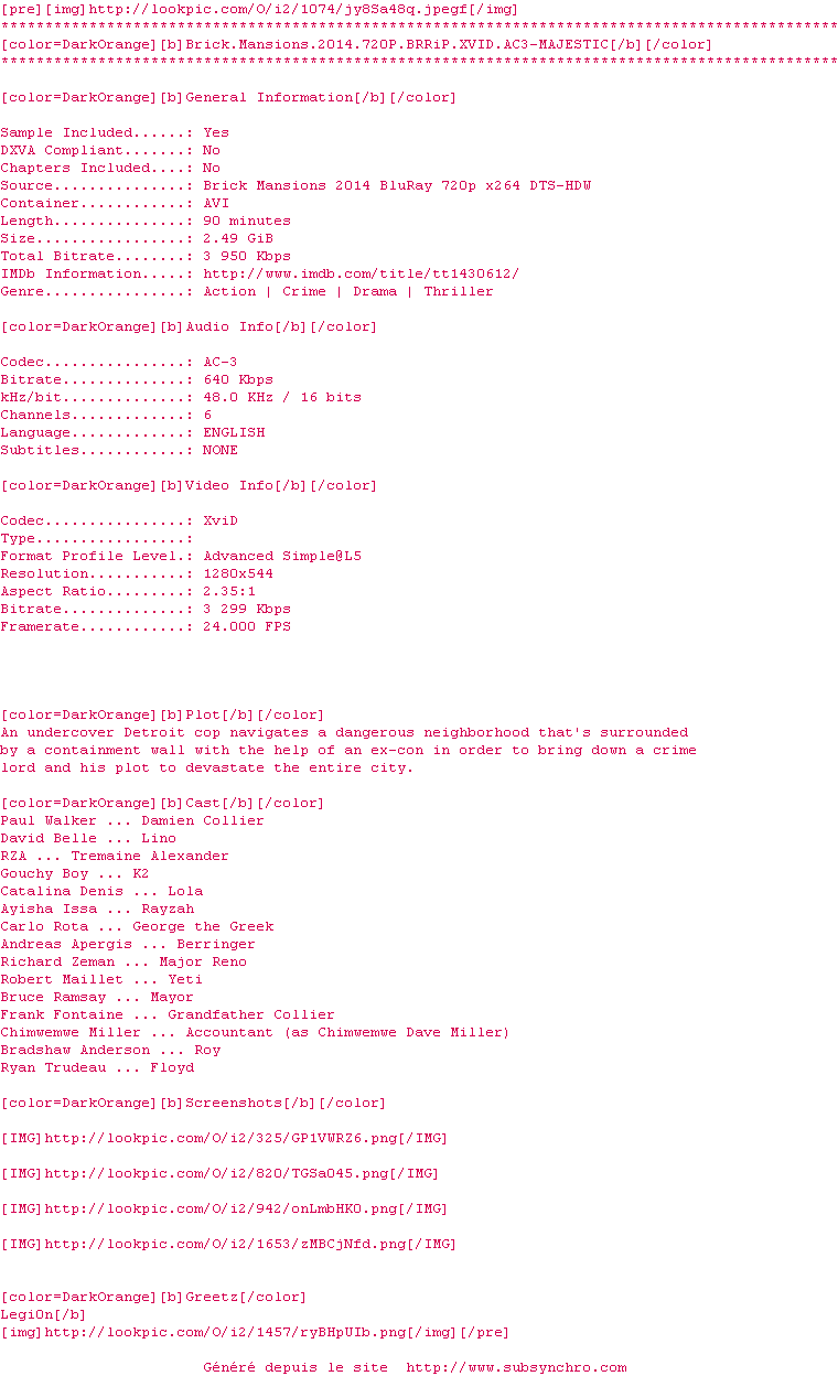 Y avez-vous pense ? Nous proposons déjà 8 sous-titres pour le film Brick Mansions. Avez-vous essaye de voir si ces sous-titres etaient compatibles avec cette release ? On vous laisse le soin de tester cela pour nous et de contribuer au site en postant le sous-titre en cas de compatiblite constatee !