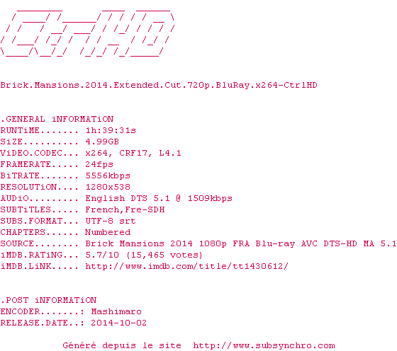 Y avez-vous pense ? Nous proposons déjà 8 sous-titres pour le film Brick Mansions. Avez-vous essaye de voir si ces sous-titres etaient compatibles avec cette release ? On vous laisse le soin de tester cela pour nous et de contribuer au site en postant le sous-titre en cas de compatiblite constatee !