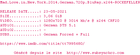 Y avez-vous pense ? Nous proposons déjà 3 sous-titres pour le film Mad Love in New York. Avez-vous essaye de voir si ces sous-titres etaient compatibles avec cette release ? On vous laisse le soin de tester cela pour nous et de contribuer au site en postant le sous-titre en cas de compatiblite constatee !