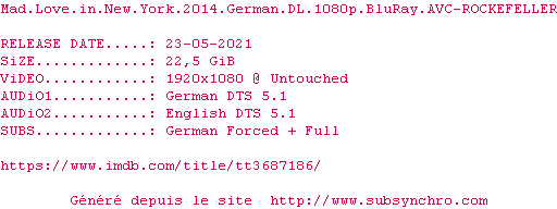 Y avez-vous pense ? Nous proposons déjà 3 sous-titres pour le film Mad Love in New York. Avez-vous essaye de voir si ces sous-titres etaient compatibles avec cette release ? On vous laisse le soin de tester cela pour nous et de contribuer au site en postant le sous-titre en cas de compatiblite constatee !