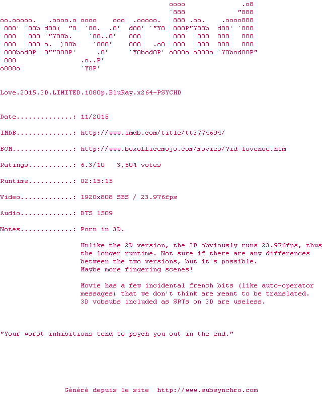 Y avez-vous pense ? Nous proposons déjà 7 sous-titres pour le film Love. Avez-vous essaye de voir si ces sous-titres etaient compatibles avec cette release ? On vous laisse le soin de tester cela pour nous et de contribuer au site en postant le sous-titre en cas de compatiblite constatee !