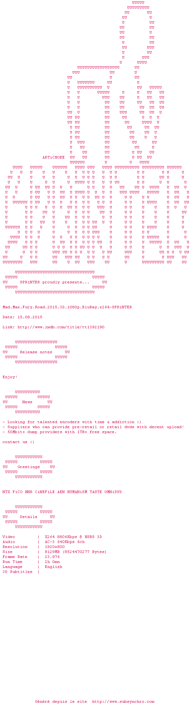 Y avez-vous pense ? Nous proposons déjà 28 sous-titres pour le film Mad Max: Fury Road. Avez-vous essaye de voir si ces sous-titres etaient compatibles avec cette release ? On vous laisse le soin de tester cela pour nous et de contribuer au site en postant le sous-titre en cas de compatiblite constatee !