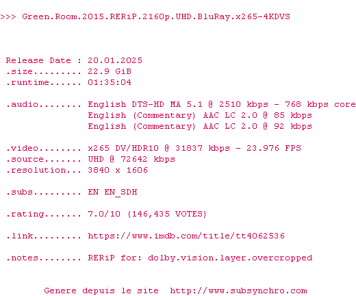 Y avez-vous pense ? Nous proposons déjà 11 sous-titres pour le film Green Room. Avez-vous essaye de voir si ces sous-titres etaient compatibles avec cette release ? On vous laisse le soin de tester cela pour nous et de contribuer au site en postant le sous-titre en cas de compatiblite constatee !