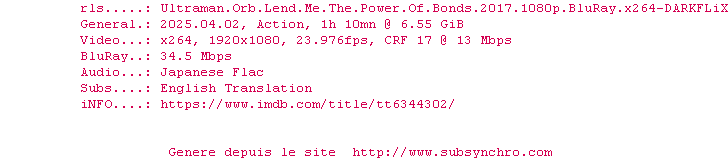 Telechargez le RSS « Fichier de la release Ultraman.Orb.Lend.Me.The.Power.Of.Bonds.2017.1080p.BluRay.x264-DARKFLiX »
