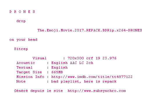 Y avez-vous pense ? Nous proposons déjà 2 sous-titres pour le film Le Monde secret des Emojis. Avez-vous essaye de voir si ces sous-titres etaient compatibles avec cette release ? On vous laisse le soin de tester cela pour nous et de contribuer au site en postant le sous-titre en cas de compatiblite constatee !