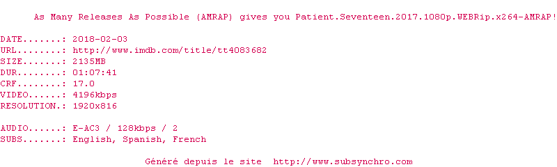 Patient.Seventeen.2017.1080p.WEBRip.x264-AMRAPEtHD_track5_fre-HI.srt Ajouté par SubSynchro Ajoute le 05-02-2018 07:30:14 Format : SRT Italique : Non Taille : 0.00Ko Telechargement : 49 Merci àRzainaddin Ajouter cette release à ma collection en cas de telechargement des sous-titres 0 0 0 Telecharger le ZiP contenant NFO, Affiche, Sous-titre (*.srt) Commentez le fichier Patient.Seventeen.2017.1080p.WEBRip.x264-AMRAPEtHD_track5_fre-HI.srt Commentez le fichier Patient.Seventeen.2017.1080p.WEBRip.x264-AMRAPEtHD_track5_fre-HI.srt Commentez ce fichier Le fichier 1-1517812214.srt n'existe pas ! Telechargez le RSS « Fichier de la release Patient.Seventeen.2017.1080p.WEBRip.x264-AMRAP » Retour au film « Patient Seventeen »