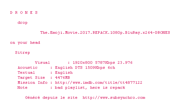 Y avez-vous pense ? Nous proposons déjà 2 sous-titres pour le film Le Monde secret des Emojis. Avez-vous essaye de voir si ces sous-titres etaient compatibles avec cette release ? On vous laisse le soin de tester cela pour nous et de contribuer au site en postant le sous-titre en cas de compatiblite constatee !