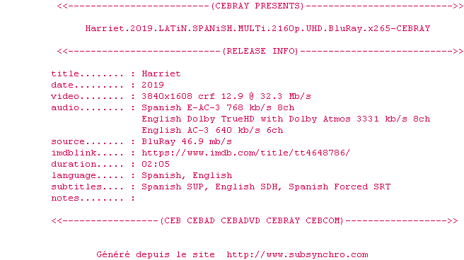Y avez-vous pense ? Nous proposons déjà 4 sous-titres pour le film Harriet. Avez-vous essaye de voir si ces sous-titres etaient compatibles avec cette release ? On vous laisse le soin de tester cela pour nous et de contribuer au site en postant le sous-titre en cas de compatiblite constatee !