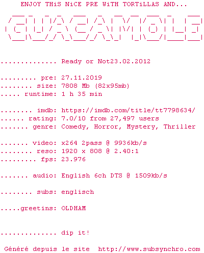Ready.or.Not.2019.720p.BluRay.x264-GUACAMOLE.srt Ajouté par Hurukan Ajoute le 01-01-2021 16:37:03 Format : SRT Italique : Oui Taille : 0.00Ko Telechargement : 80 Sous-titre Extrait d'un DVD Z2 Ajouter cette release à ma collection en cas de telechargement des sous-titres 0 0 0 Telecharger le ZiP contenant NFO, Affiche, Sous-titre (*.srt) Commentez le fichier Ready.or.Not.2019.720p.BluRay.x264-GUACAMOLE.srt Commentez le fichier Ready.or.Not.2019.720p.BluRay.x264-GUACAMOLE.srt Commentez ce fichier Le fichier 2642-1609515423.srt n'existe pas ! Telechargez le RSS « Fichier de la release Ready.Or.Not.2019.1080p.BluRay.x264-GUACAMOLE » Retour au film « Wedding Nightmare »