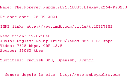 Y avez-vous pense ? Nous proposons déjà 4 sous-titres pour le film American Nightmare 5 : Sans limites. Avez-vous essaye de voir si ces sous-titres etaient compatibles avec cette release ? On vous laisse le soin de tester cela pour nous et de contribuer au site en postant le sous-titre en cas de compatiblite constatee !