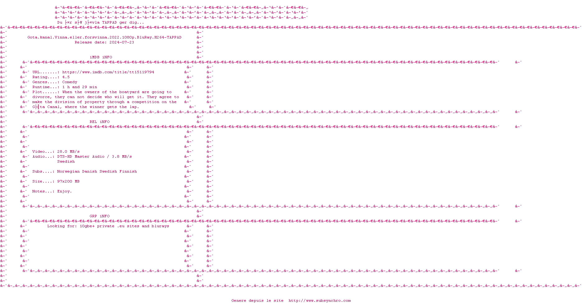 Telechargez le RSS « Fichier de la release Gota.Kanal.Vinna.Eller.Forsvinna.2022.1080p.BluRay.H264-TAPPAD »