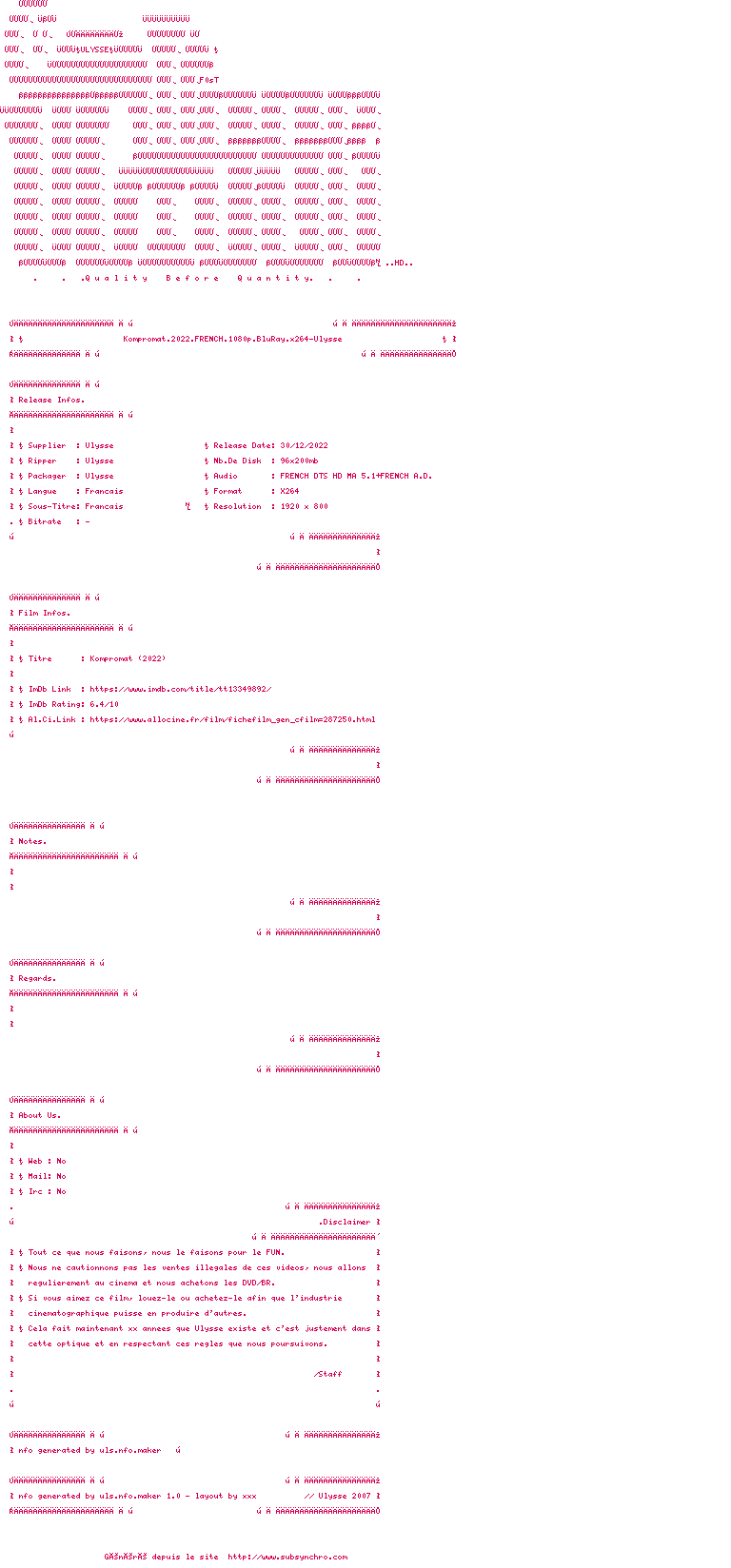 Y avez-vous pense ? Nous proposons déjà 1 sous-titre pour le film Kompromat. Avez-vous essaye de voir si ces sous-titres etaient compatibles avec cette release ? On vous laisse le soin de tester cela pour nous et de contribuer au site en postant le sous-titre en cas de compatiblite constatee !