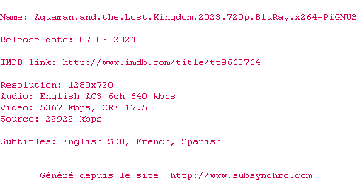 Y avez-vous pense ? Nous proposons déjà 11 sous-titres pour le film Aquaman et le Royaume perdu. Avez-vous essaye de voir si ces sous-titres etaient compatibles avec cette release ? On vous laisse le soin de tester cela pour nous et de contribuer au site en postant le sous-titre en cas de compatiblite constatee !
