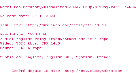 Y avez-vous pense ? Nous proposons déjà 2 sous-titres pour le film Simetierre : Aux origines du mal. Avez-vous essaye de voir si ces sous-titres etaient compatibles avec cette release ? On vous laisse le soin de tester cela pour nous et de contribuer au site en postant le sous-titre en cas de compatiblite constatee !