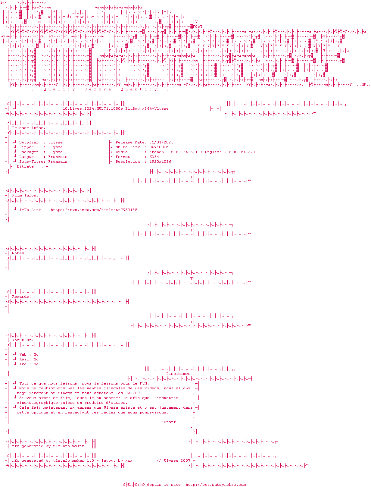 10.lives.2024.multi.1080p.bluray.x264-ulysse.srt Ajouté par SubSynchro Ajoute le 10-02-2025 09:41:32 Format : SRT Italique : Non Taille : 0.00Ko Telechargement : 53 Merci à epongeBob sur OpenSubtiles Ajouter cette release à ma collection en cas de telechargement des sous-titres 0 0 0 Telecharger le ZiP contenant NFO, Affiche, Sous-titre (*.srt) Commentez le fichier 10.lives.2024.multi.1080p.bluray.x264-ulysse.srt Commentez le fichier 10.lives.2024.multi.1080p.bluray.x264-ulysse.srt Commentez ce fichier Le fichier 1-1739176892.srt n'existe pas ! Telechargez le RSS « Fichier de la release 10.Lives.2024.MULTi.1080p.BluRay.x264-Ulysse » Retour a la release « 10.Lives.2024.MULTi.1080p.BluRay.x264-Ulysse »