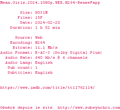 Y avez-vous pense ? Nous proposons déjà 7 sous-titres pour le film Mean Girls, lolita malgré moi. Avez-vous essaye de voir si ces sous-titres etaient compatibles avec cette release ? On vous laisse le soin de tester cela pour nous et de contribuer au site en postant le sous-titre en cas de compatiblite constatee !