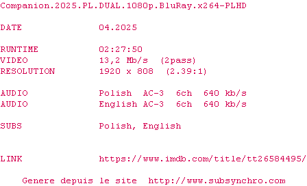 Y avez-vous pense ? Nous proposons déjà 3 sous-titres pour le film Companion. Avez-vous essaye de voir si ces sous-titres etaient compatibles avec cette release ? On vous laisse le soin de tester cela pour nous et de contribuer au site en postant le sous-titre en cas de compatiblite constatee !