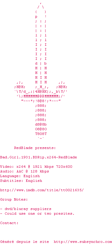 Voir le nfo de la release Bad.Girl.1931.BDRip.x264-RedBlade
