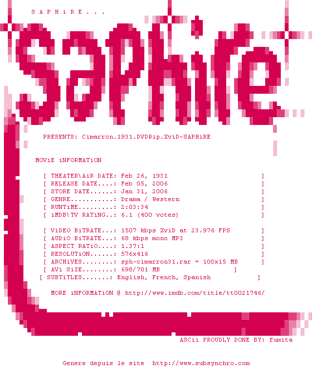 Telechargez le RSS « Fichier de la release Cimarron.1931.DVDRip.XviD-SAPHiRE »
