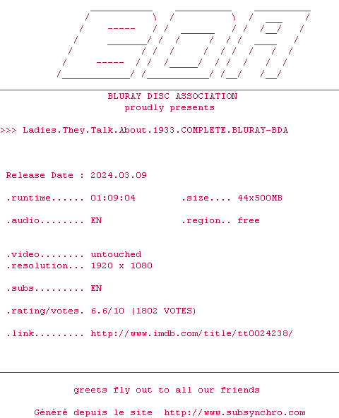Voir le nfo de la release Ladies.They.Talk.About.1933.COMPLETE.BLURAY-BDA