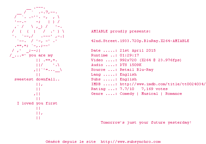 Telechargez le RSS « Fichier de la release 42nd.Street.1933.720p.BluRay.X264-AMIABLE »