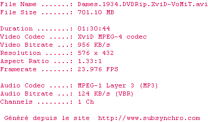 | Voir le nfo de la release Dames.1934.DVDRip.XviD-VoMiT | VoMiT | Dames.1934.DVDRip.XviD-VoMiT OpenSubtitles | 0 fichier |