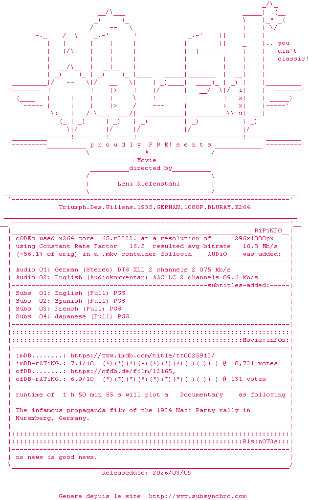 Voir le nfo de la release Triumph.Des.Willens.1935.GERMAN.1080P.BLURAY.AVC-UNDERTAKERS