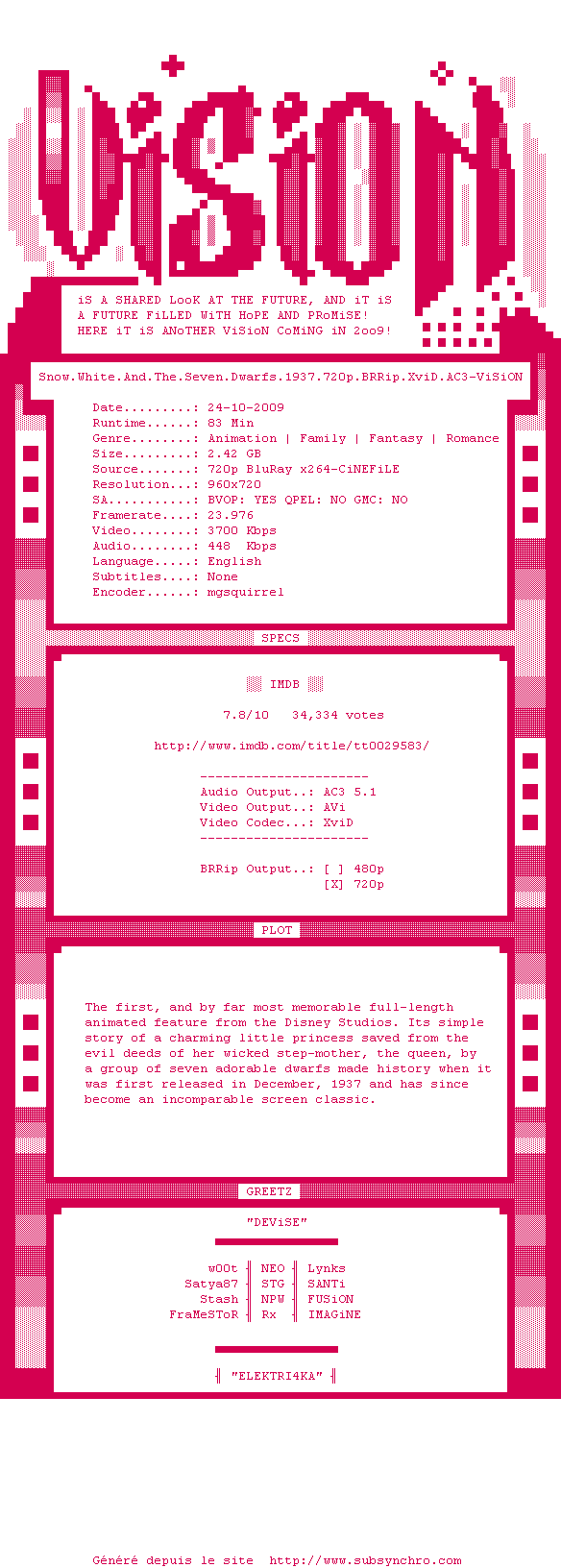 Voir le nfo de la release Snow.White.And.The.Seven.Dwarfs.1937.720p.BRRip.XviD.AC3-ViSiON
