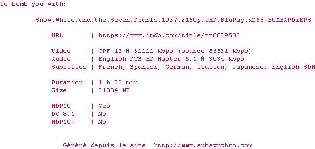 Voir le nfo de la release Snow.White.And.The.Seven.Dwarfs.1937.2160p.UHD.BluRay.x265-B0MBARDiERS