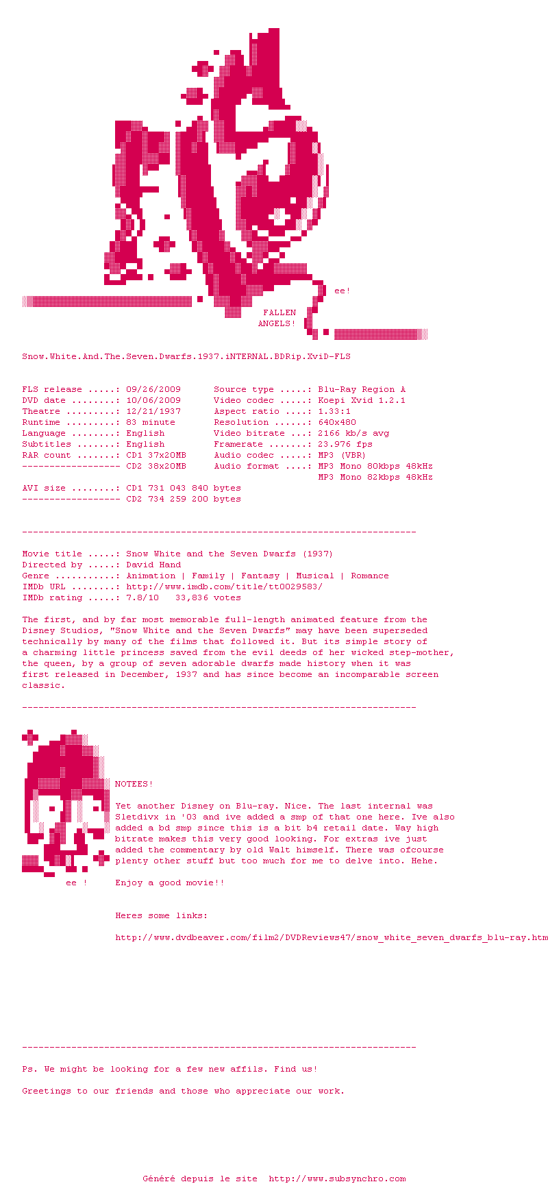 Voir le nfo de la release Snow.White.And.The.Seven.Dwarfs.1937.iNTERNAL.BDRip.XviD-FLS